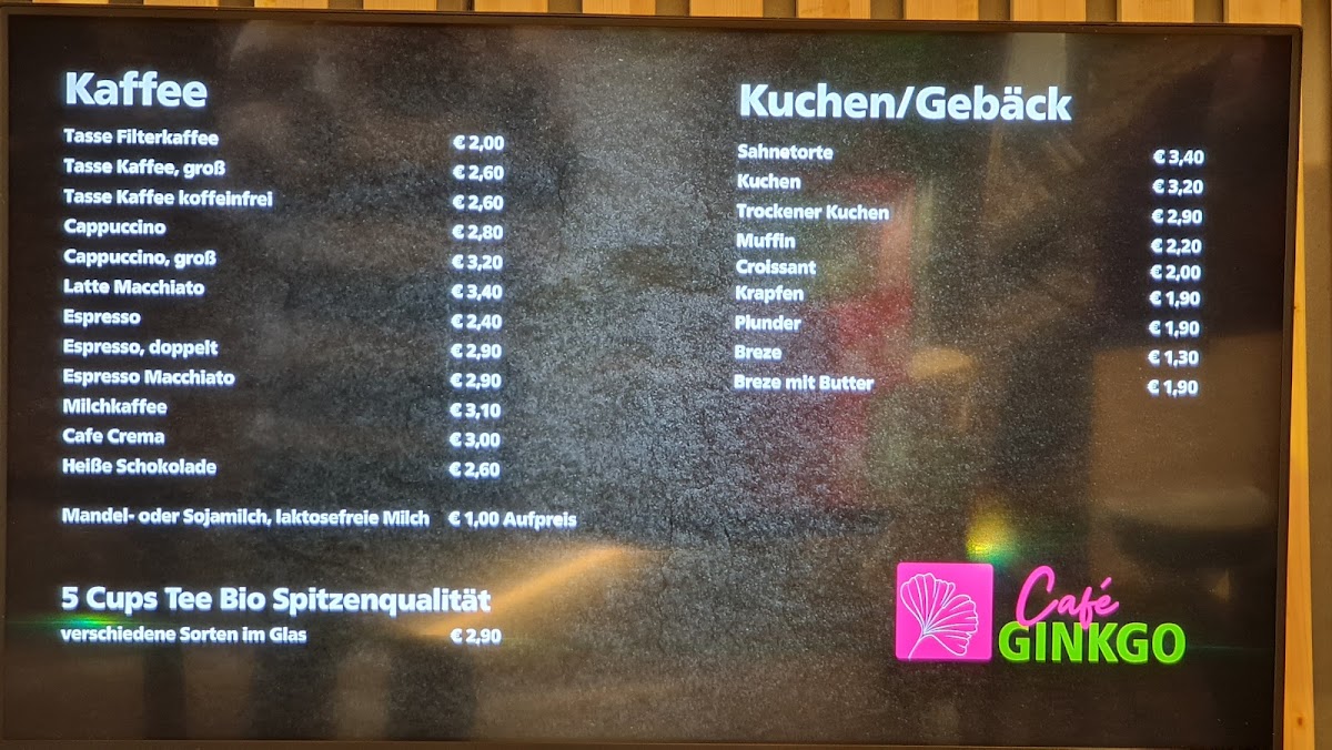 The menu at Café Ginkgo features a variety of offerings suited for breakfast, coffee breaks, and light meals. Visitors can expect selections that include breakfast dishes, a range of coffee specialties, ice cream options, and refreshing beverages. Common menu items mentioned by customers include traditional breakfast combinations, coffee drinks such as cappuccino, and dessert options like Schwarzwälder Kirschtorte.